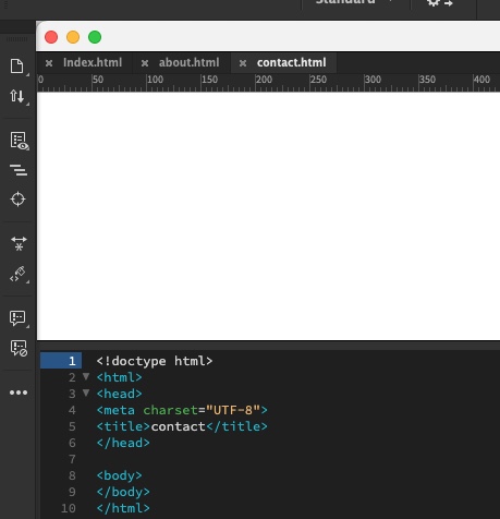 This will open a blank document in Dreamweaver. You will see a tab called ‘Untitled-1’ in the top left bar. This is because the file is not yet saved. Hit ‘save’ and save the file as Index.html in the correct folder of the folder structure you created. One HTML document called ‘index.html’ is enough for this LT.