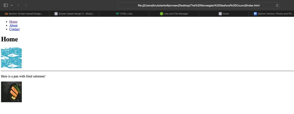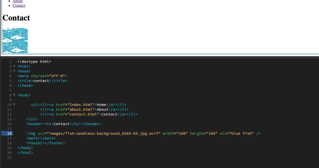 In your index.html document, add one image to one of the page <body> sections using a relative file path. Note that you need to take special care about where you put the image in the folder structure and how you link the ‘href’. Add text for the alt attribute. This should describe the image in some way in case the image is not displayed.