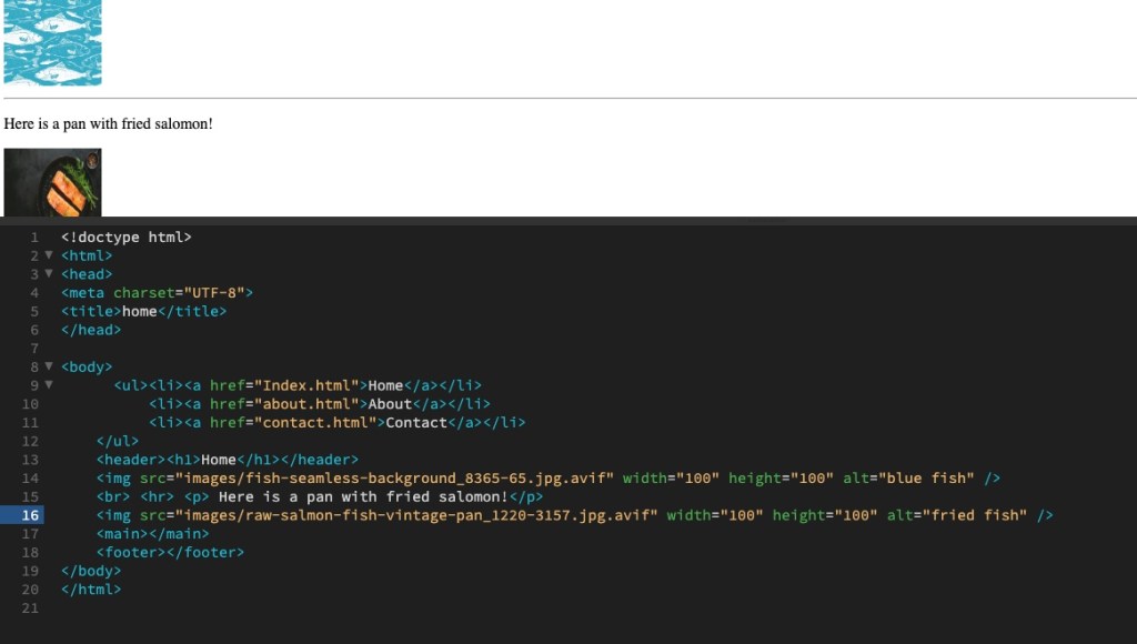 Add another image. Observe how the images are placed on the HTML page. Add a <br> element between the images to see how the layout changes. Add an <hr> element to insert a line break between the images. Finally, add a <p> element between the images.