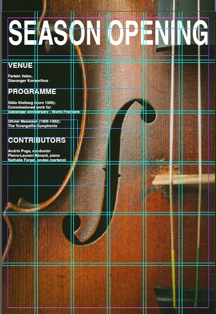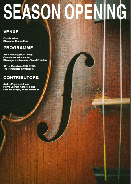 Design an A2 poster for a Stavanger Symphony Orchestra concert. The concert consists of two parts. The first is a commission from local composer Ståle Kleiberg who’s known as a composer for grand occasions. The Turangalîla-Symphonie by Messiaen follows the intermission, which according to the composer, is a love song.