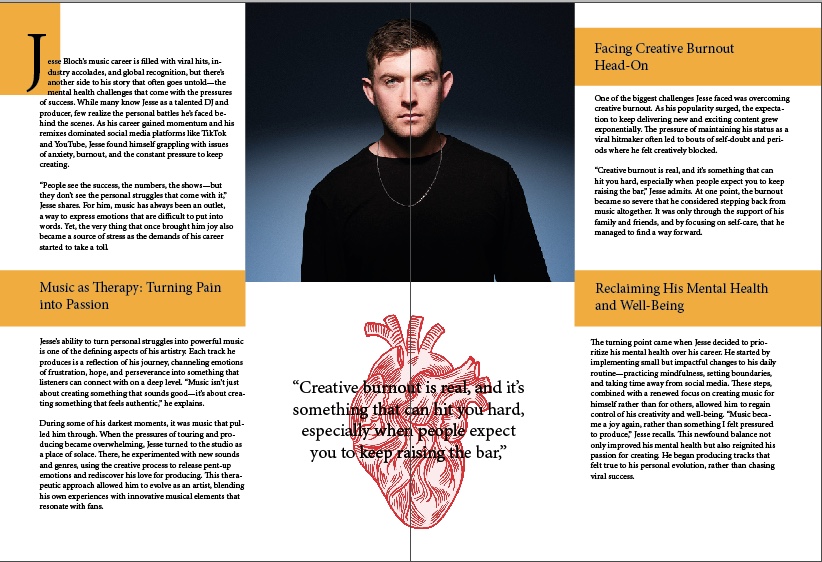 - Maybe consider playing around with the layout a bit, like using the second photo of the first spread on the second spread rather, to ‘fill’ it a bit more with content. You could just leave the open space where the photograph was as negative space. Also, consider keeping the sub-headings on the second spread in yellow blocks to be more consistent with the first page spread.